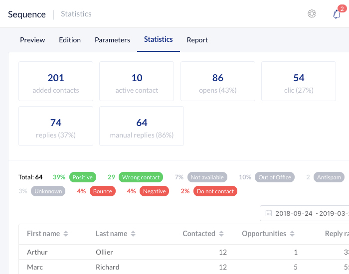 Datananas delivers statistics based on reply categories and go further with sales team details such as qualification rate or opportunity conversion rate, per sequence and per user.